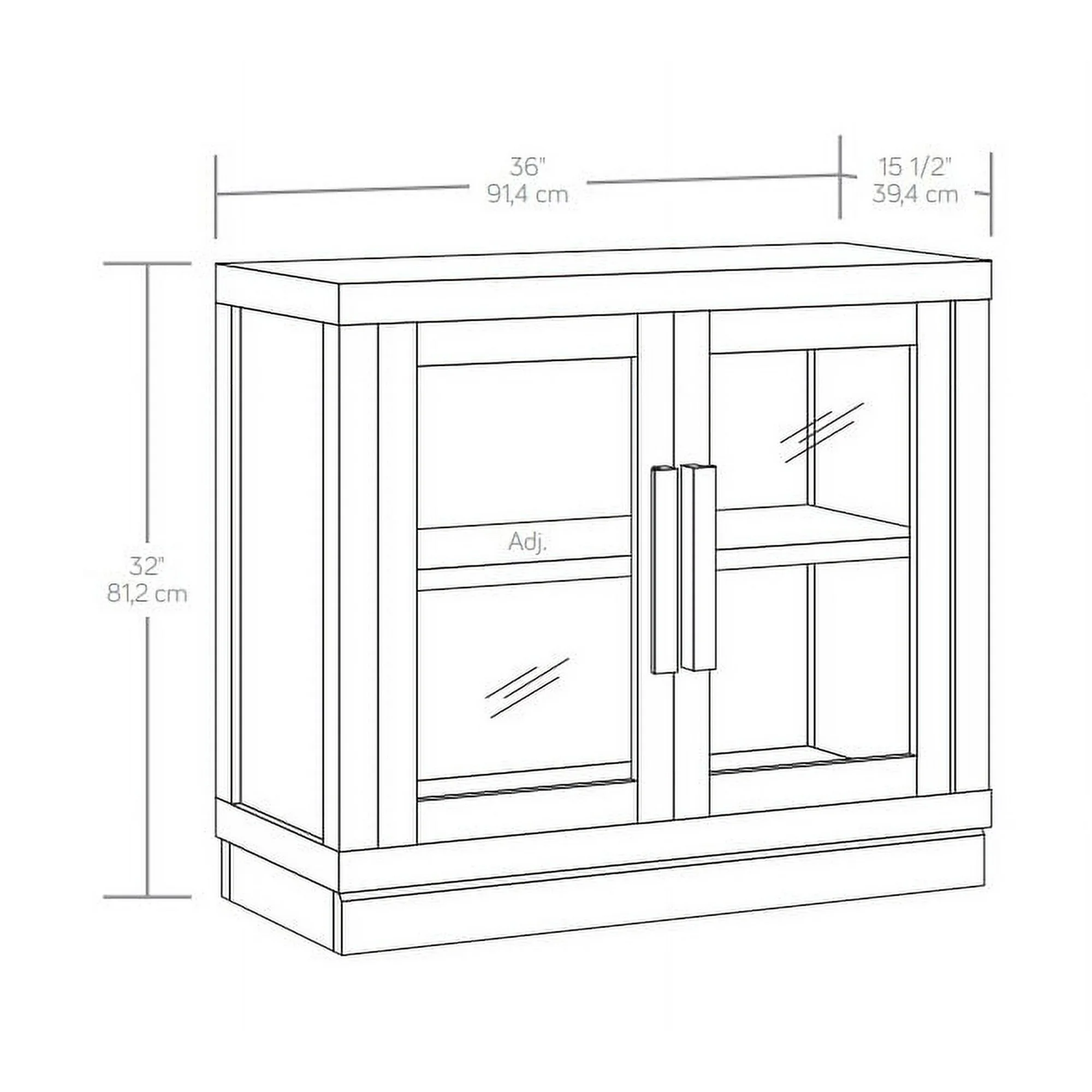 The Ezra Accent Cabinet presents a modern display cabinet that offers an effortless infusion of style into any room of the home. Create versatile storage and display options in the living room, dining room, entryway or kitchen with the modern geometric design of this utility wood accent cabinet. Behind its set of framed, safety-tempered glass doors with soft-close hinges, this fashion cabinet provides an adjustable, spacious shelf. Along with the bottom shelf, the display area is ideal for showcasing a prized collection of antiques, vintage China, or photos of family and friends. This living room storage cabinet has a strong and lightweight 2-inch panel construction and built-in adjustable base levelers so that it is durable yet versatile in any living space.